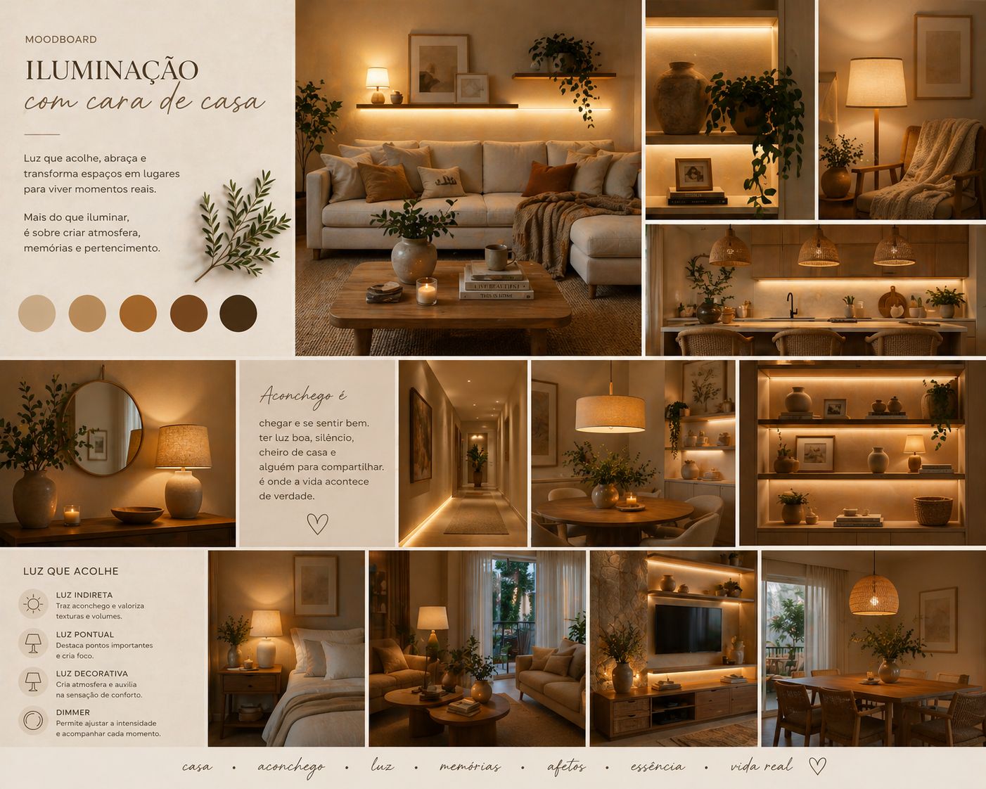 A iluminação é uma das grandes responsáveis pela sensação de conforto dentro de casa. Luzes indiretas, perfis de LED, abajures e pontos de iluminação mais quentes ajudam a criar uma atmosfera agradável e intimista, principalmente nos momentos de descanso.
