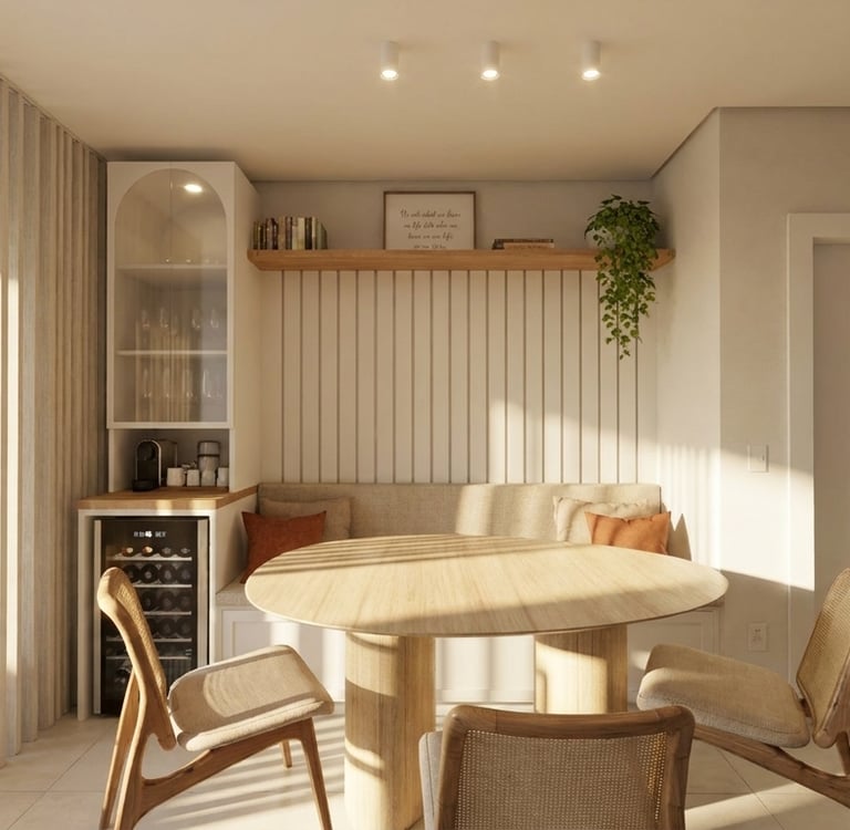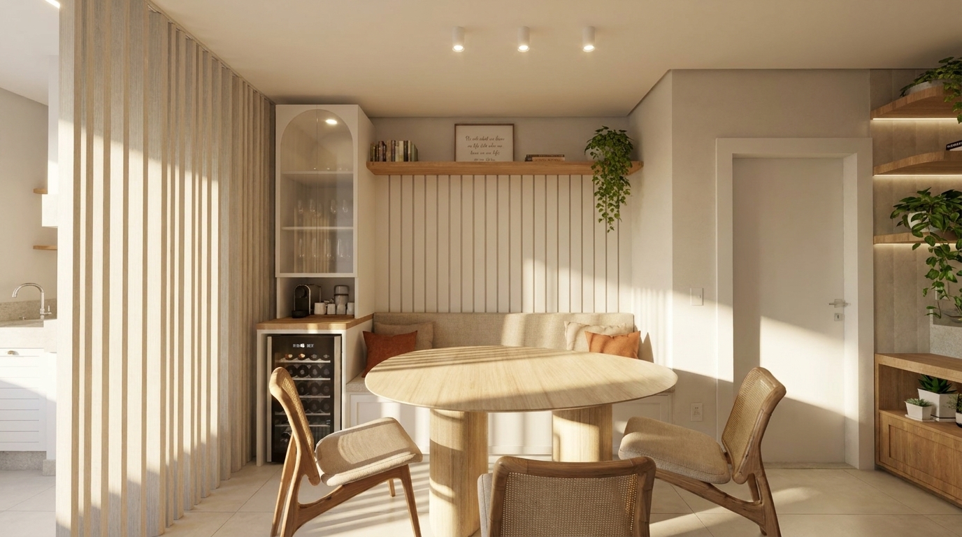 Ambientes integrados precisam conversar entre si. Quando sala, jantar e cozinha possuem a mesma linguagem estética, o apartamento ganha fluidez e sensação de amplitude. A escolha correta dos materiais, iluminação e paleta de cores faz toda a diferença nesse equilíbrio.